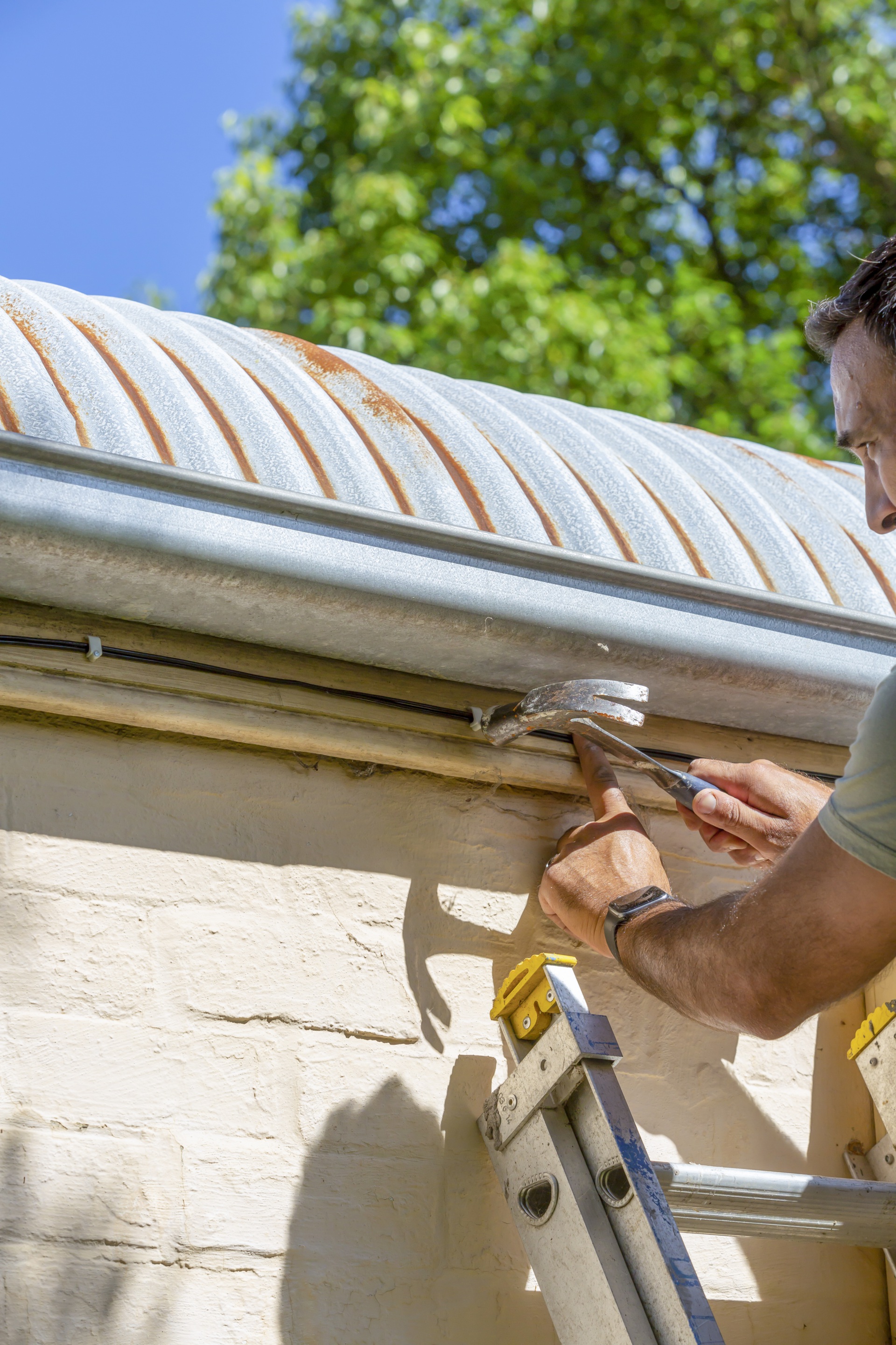 Use a hacksaw to cut the brackets for a metal roof. Secure with supplied nuts, bolts and washers, tightening with a spanner. Set up ladder on a solid surface.