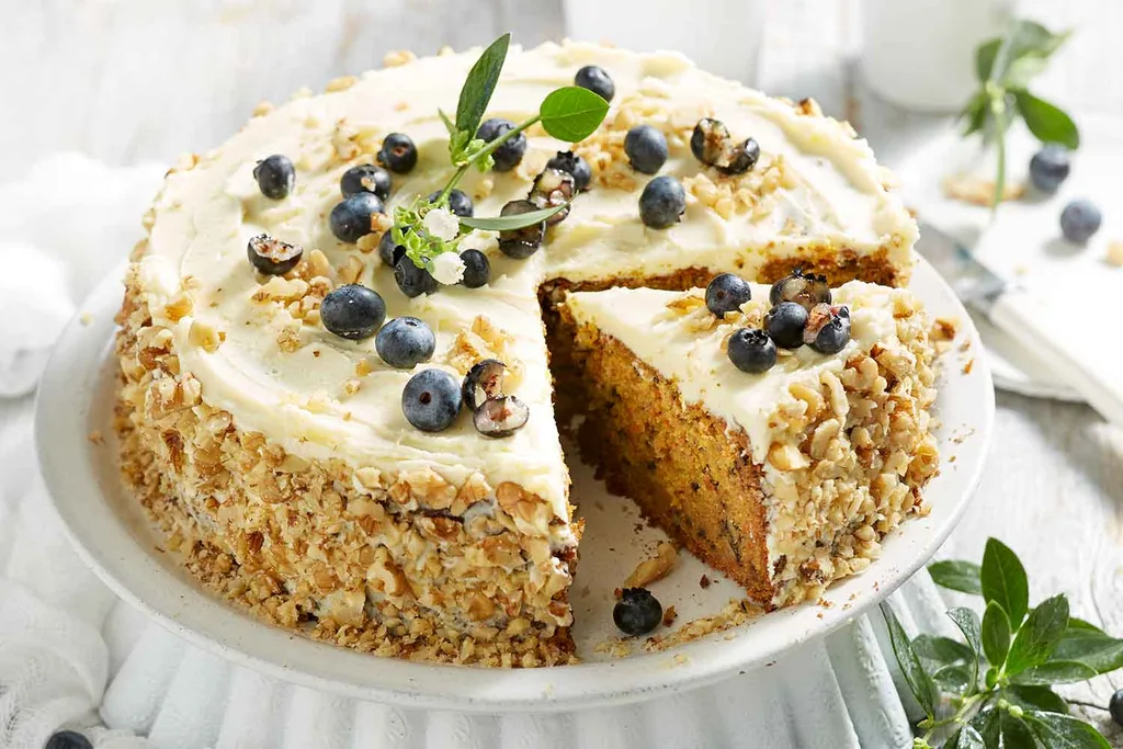 Cover side of cooled cake with a thin layer of frosting, and spread remaining on top. Firmly press extra finely chopped walnuts around side of cake so they adhere to icing. Garnish top of cake with blueberries, extra roughly chopped walnuts and blueberry leaves (for decoration only, do not eat). Serve.