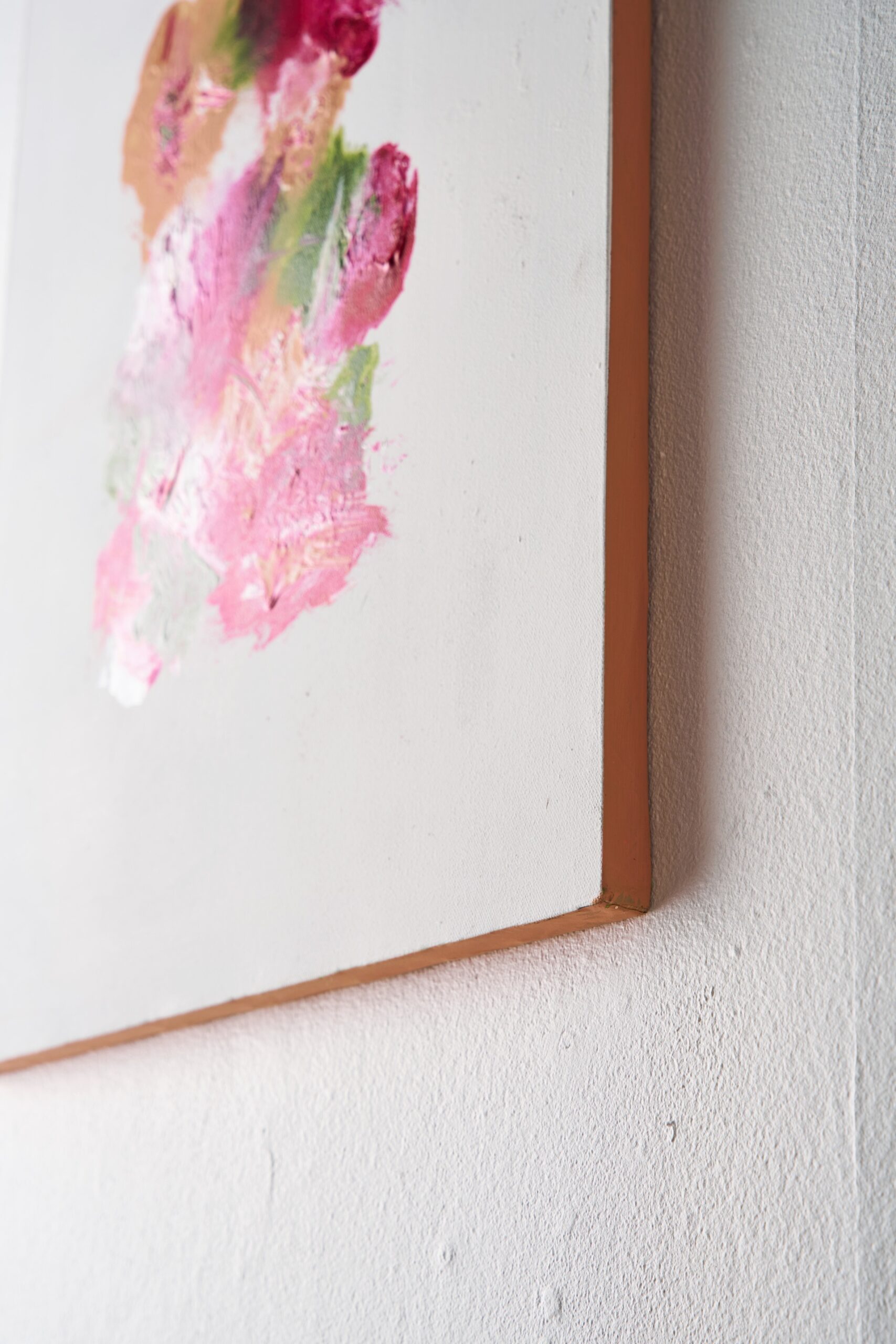 and hide any staples up the side of the canvas with painted masking tape in a colour that matches the work’s palette. Measure and cut four strips of tape to fit your frame surround. Apply strips flat to a clean, smooth surface (we used a plastic sheet). Apply two coats of paint, allowing to dry after each coat. Peel back the tape, then apply to the edges of your pet’s masterpiece.
